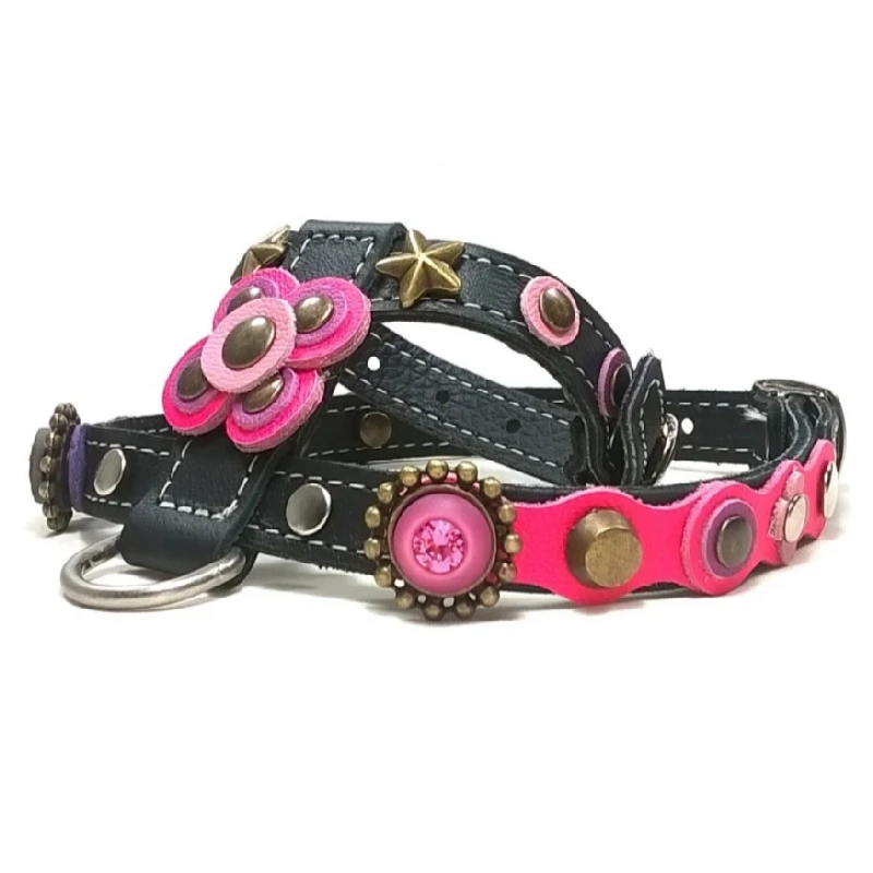 Un harnais pour chien en cuir style “Fuchsia Fantasy Flair”, décoré d’une grande fleur rose, de patchs fuchsia et violets, de petites fleurs roses, d’étoiles en laiton, de studs en laiton et argent, et d’un ornement avec pierres rose et sable doré.