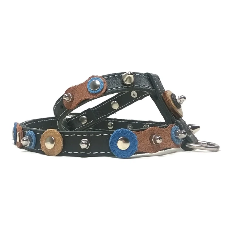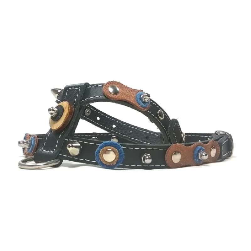 Un harnais robuste et chic avec des patches en cuir bleu jeans et brun, fixés avec de petits boulons et écrous, complétés par des clous plats argentés et des pointes arrondies. Un design artisanal avec un disque en bois d’olivier verni visible sur le dos.