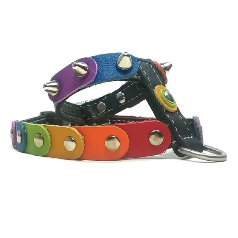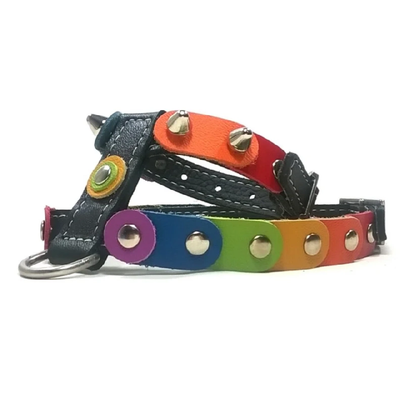 Un harnais pour chien en cuir, décoré de patches en cuir arc‑en‑ciel inspirés des couleurs de la liberté. Embelli de pointes argentées arrondies et doté d’une couche intérieure renforcée. Disponible en cuir Noir ou Marron. “Rainbow Liberty” convient aux chiens confiants et expressifs qui aiment briller avec couleur et personnalité.