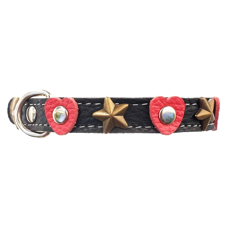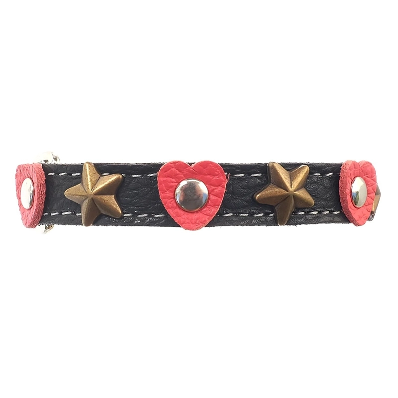 Afgewisseld met de hartjes zijn bronzen stervormige studs die een hemelse flair geven. Hun warme glans harmonieert met de rode hartjes en creëert een patroon dat voelt als een liefdesverhaal geschreven in de sterren. Voor katten met een sprankelende persoonlijkheid en een vleugje mysterie.